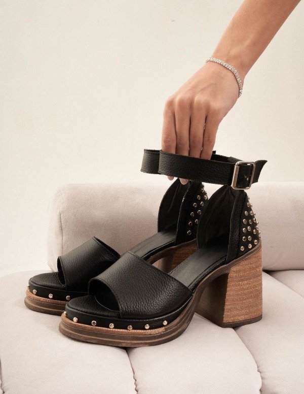 Las Sandalias Roma en cuero vacuno legítimo son un clásico moderno que eleva cualquier look. Su diseño en negro total con detalles de tachas metálicas aporta carácter y sofisticación, mientras que el taco de 12 cm estiliza tu figura y asegura una presencia única. Ideales para combinar tanto con jeans como con vestidos, son el must-have de la temporada.