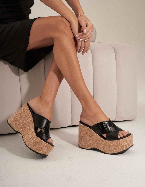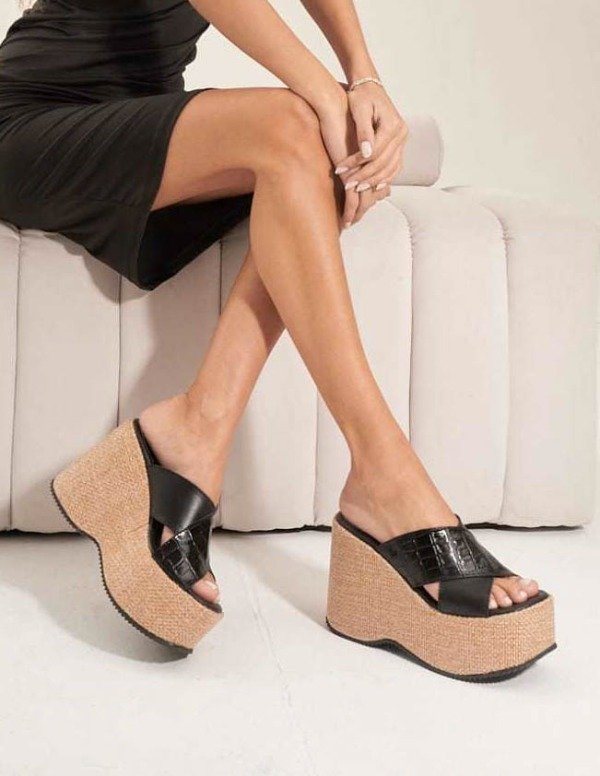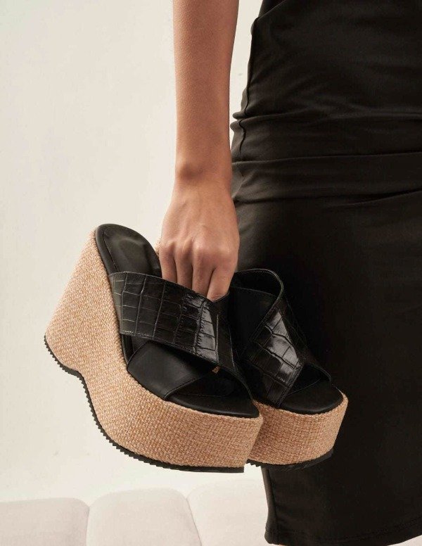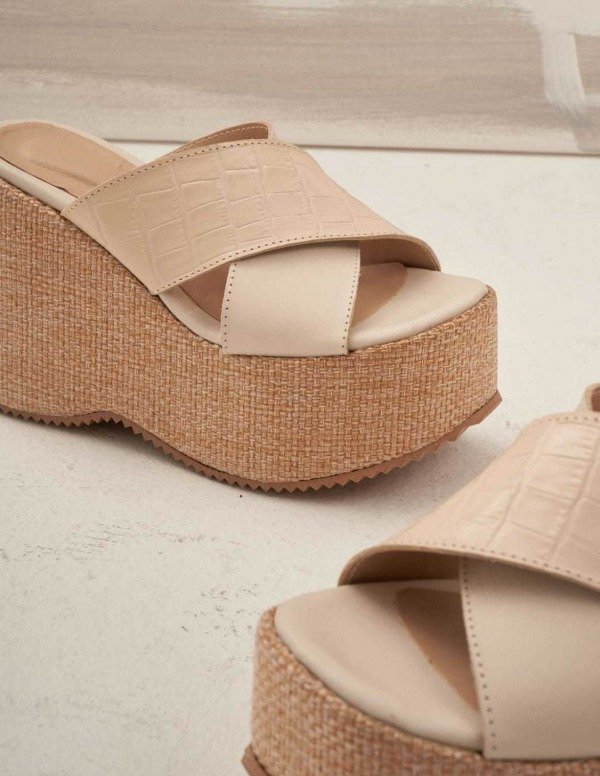 Un diseño que combina estilo y comodidad para realzar cualquier look. Estos suecos están confeccionados en cuero vacuno de primera calidad, con una plataforma alta forrada en rafia, un detalle que aporta un aire natural y moderno al mismo tiempo.