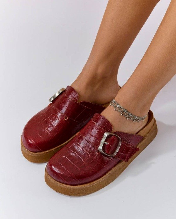 Los Zuecos Lena combinan estilo y comodidad en un diseño clásico tipo Birker. Realizados en cuero vacuno 100%, destacan por su textura croco y hebilla metálica que suma un toque moderno y sofisticado.